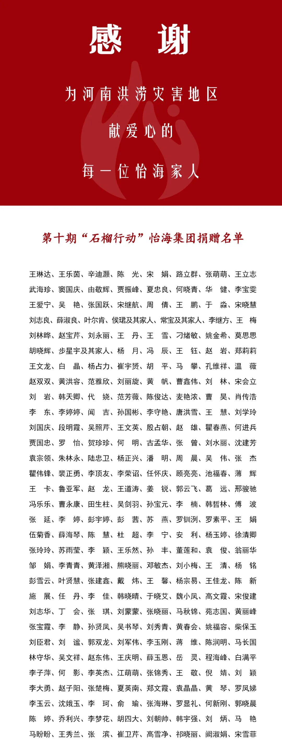 2021年7月22日,王琳达主席第一时间发出号召,怡海集团积极组织并参与由北京侨商会、中国香港(地区)商会、北京怡海公益基金会联合发起的第十期“石榴行动”——为河南洪涝灾害地区献爱心公益活动,组织北京、长沙、深圳、临沂、上海、香港、怡海北美公司、怡海塞尔维亚公司,及教育、商业、地产板块等分公司员工及华人华侨通过线上捐款方式参与“石榴行动”,伸出援助之手,以强烈的责任感和担当精神迅速响应驰援河南,帮助受灾地区群众早日战胜灾害、重建家园。美国纽约公司华人华侨,怡海塞尔维亚Z65项目承建方中建先锋集团有限公司(塞尔维亚)中方员工及塞尔维亚爱心人士200余名也参加了此次爱心捐赠活动。